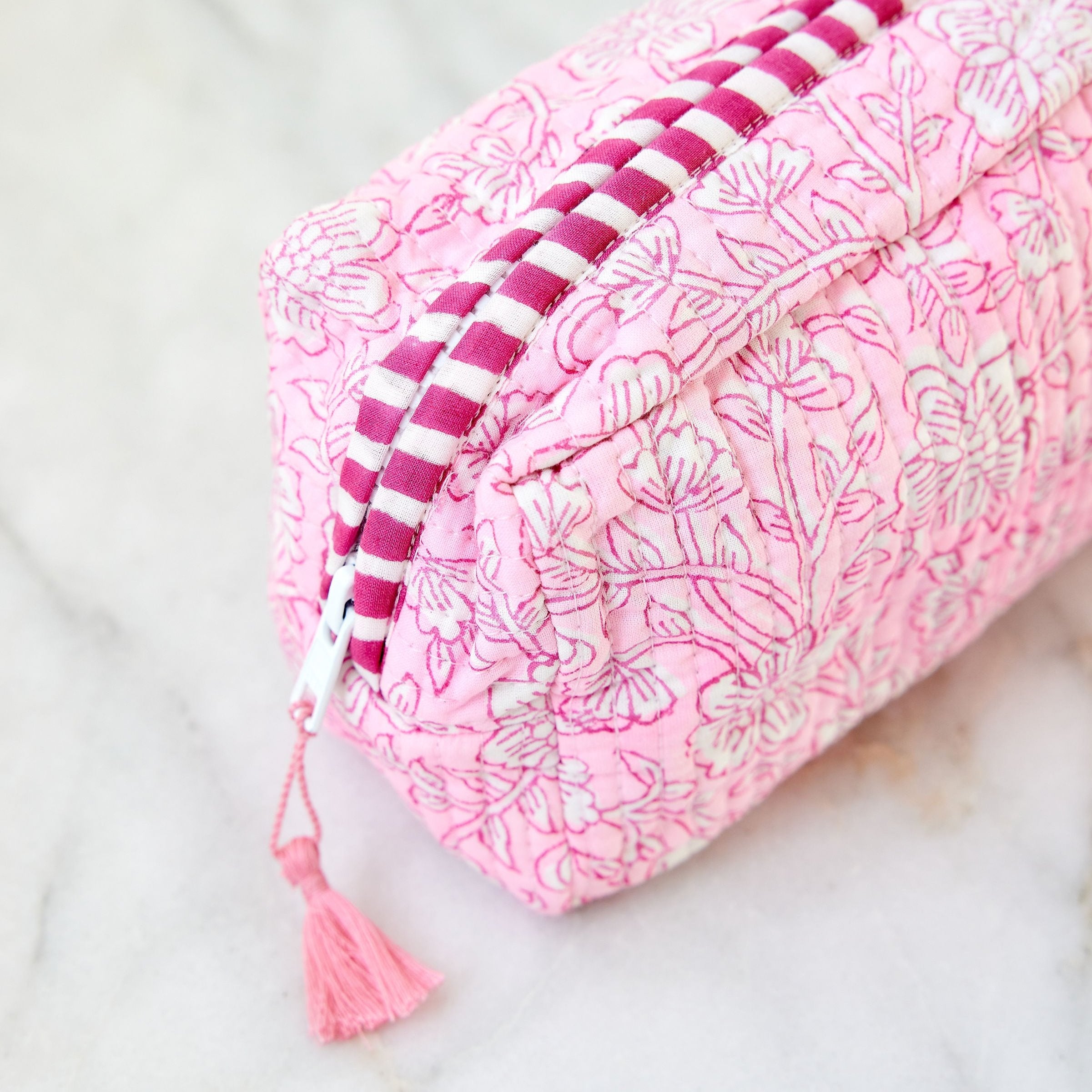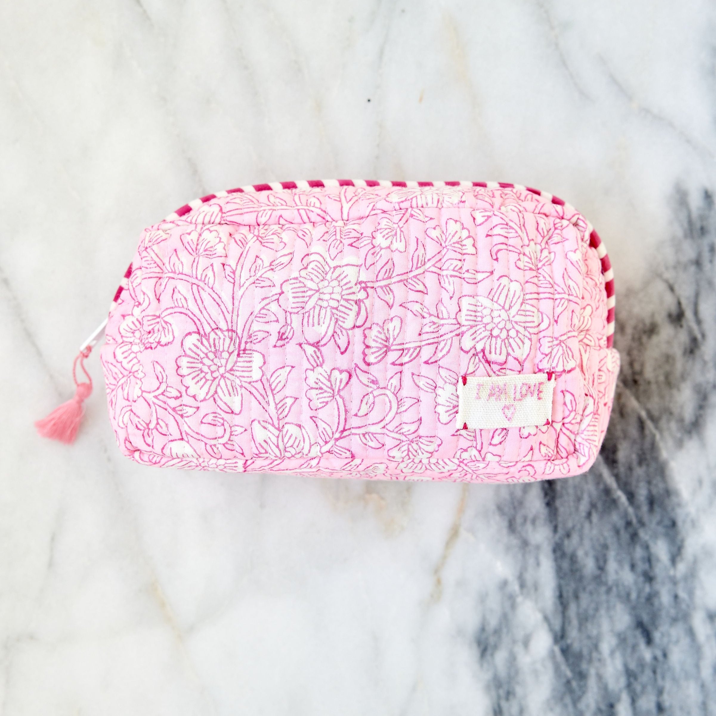 Handmade pouch in our exclusive pink fabric.